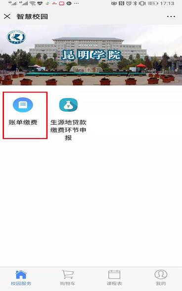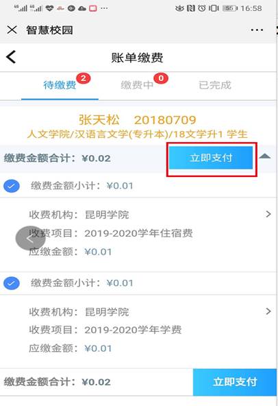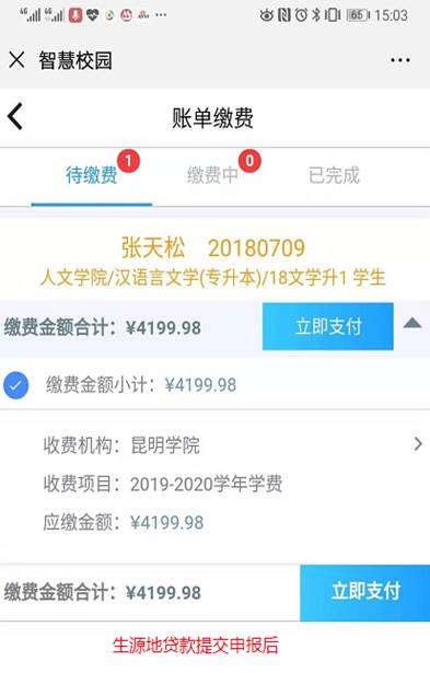 第四步:点击“账单缴费”查看缴费信息(注:已申请生源地贷款的同学,完成第七步后再进行以下操作)。仔细核对姓名和学号无误后-->立即支付;若学号或姓名不正确-->请暂停缴费并联系辅导员。