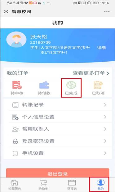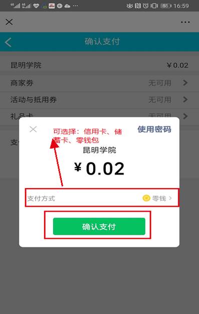 第六步:选择零钱或银行卡进行支付(图例为零钱)-->确认支付-->输入支付密码-->完成支付。点击“我的”-->“已完成”查看缴费记录。