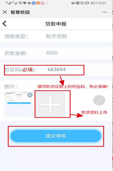 填写贷款金额-->下一步-->填写“国家开发银行生源地信用生源地贷款受理证明”(本图以国家开发银行为例)上的回执校验码并将生源地贷款相关证明材料拍照上传-->提交审核。